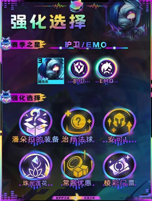 选择波比替换锤石构成4EMO阵容,该变体通过高频技能释放增强团队输出。阿木木作为赛季之星优先选择护卫天选,次选EMO天选需搭配转职纹章达成完全体。