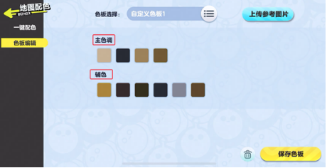 3、色板编辑器提供完整的色彩管理系统。主色区包含四个核心色位,建议优先确定场景基调色;辅助色区六个色位则可用于细节装饰,通过拖动色轮或输入色值可精准调色,已选颜色会实时映射到预览模型。