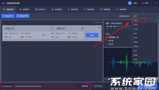 在输出参数设置区域,选择MP3格式并调整采样率等专业参数(建议普通用户保持默认设置)。确认输出目录后,点击【全部转换】按钮即可完成格式转换。该软件支持后台批量处理,转换过程中可正常使用电脑进行其他操作。